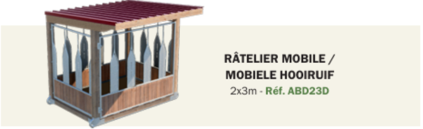 Ontdek onze mobiele hooiruif, ontworpen door ons studiebureau, uitgerust met veilige en functionele zwanenhals-voederhekken. Deze hooiruif maakt zelfbediening van ruwvoer mogelijk. Dankzij het verrijdbare chassis kan hij eenvoudig verplaatst worden zonder